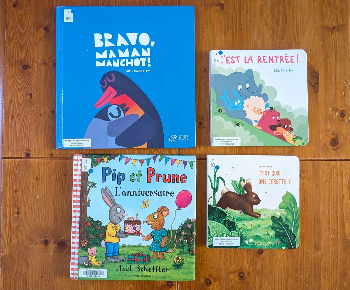 Une fois par mois environ, on va faire un tour à la bibliothèque et on emprunte une petite dizaine de livres. Il y en a toujours 1 ou 2 sur lesquels je flashe, et 2 ou 3 auxquels Ellie accroche vraiment. Des livres qu’on se retrouve à lire tous les jours, voire matin et soir, et qu’on est presque triste de rendre tant on aimerait les ranger définitivement sur nos étagères ! Il y en a peut-être quelques uns qu’on se procurera à l’avenir, s’ils nous manquent vraiment…