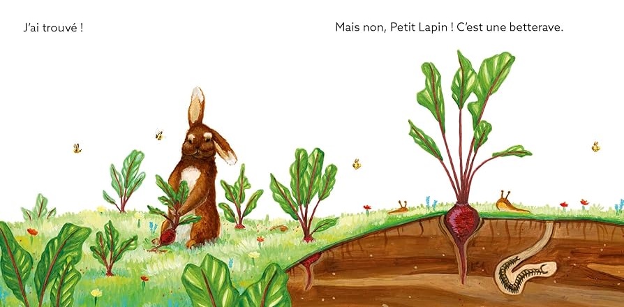 Celui-là est presque un documentaire. Un petit lapin cherche une carotte à manger dans le potager. Il s’intéresse à chaque feuille qui sort de terre… mais on voit grâce à une vue en coupe que le légume encore enterré n’est pas une carotte. C’est instructif et j’aime beaucoup les dessins.