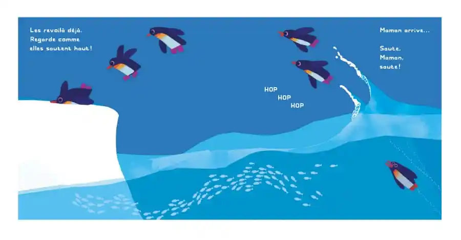 On a trouvé un autre Chris Haughton et il est très chouette. Maman Manchot va chercher du poisson pendant que Bébé et Papa Manchot l’attendent sur la banquise. Ils l’admirent de loin dans sa partie de chasse et l’encouragent à chaque étape. La nage, l’escalade, la glissade, le passage en silence devant les phoques pour ne pas les réveiller… L’aventure a des airs de compétition sportive. C’est à la fois mignon et drôle.