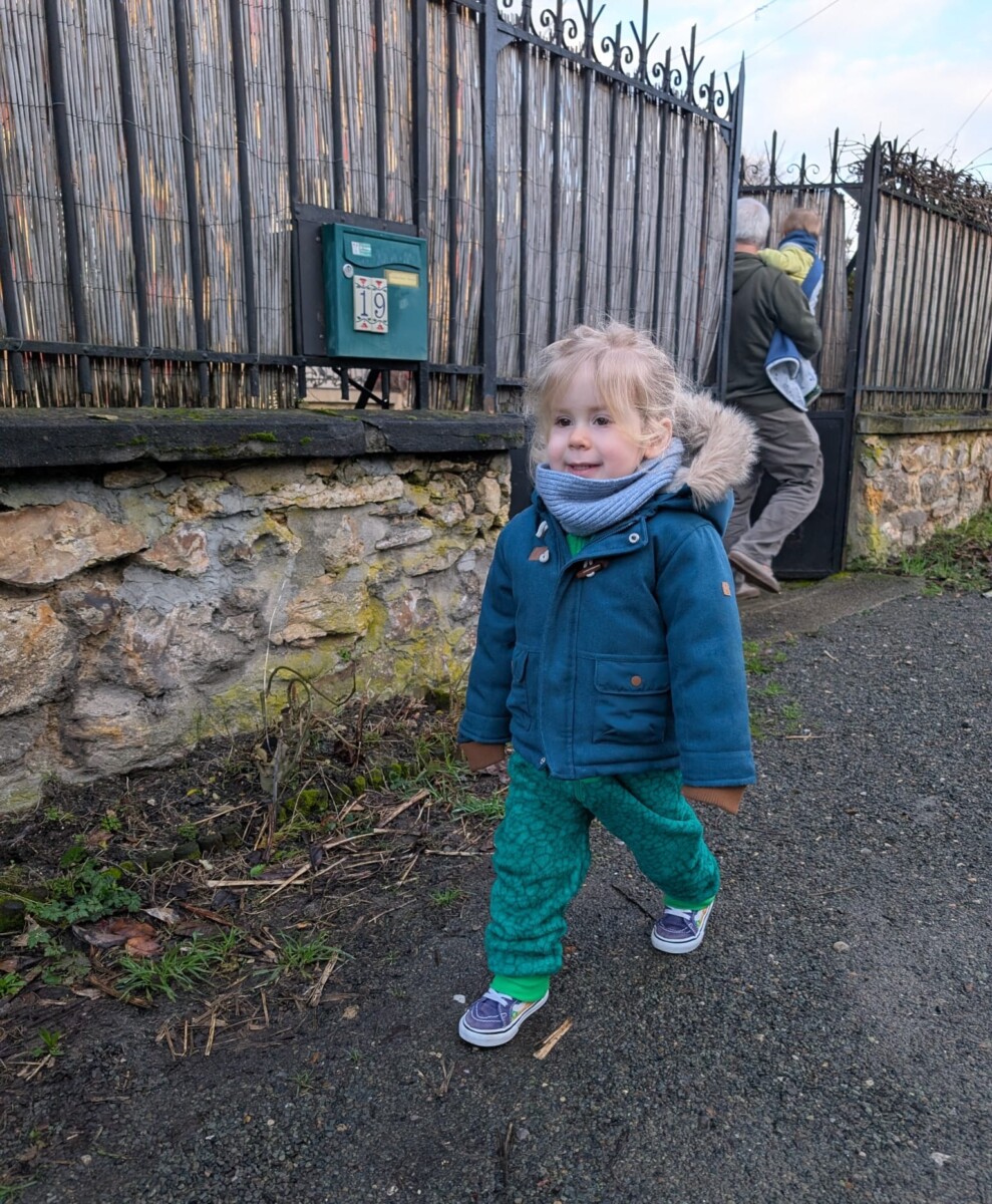 On se disait ce dimanche, en rentrant du parc, que c’est en ce moment qu’Ellie se dégourdit physiquement. Elle marche aisément depuis mai dernier, mais toujours sagement, raisonnablement jusqu’ici. Et enfin, à 2 ans et 2 mois, la voilà qui se met à courir, sauter, faire l’andouille : elle devient plus audacieuse et aventureuse.