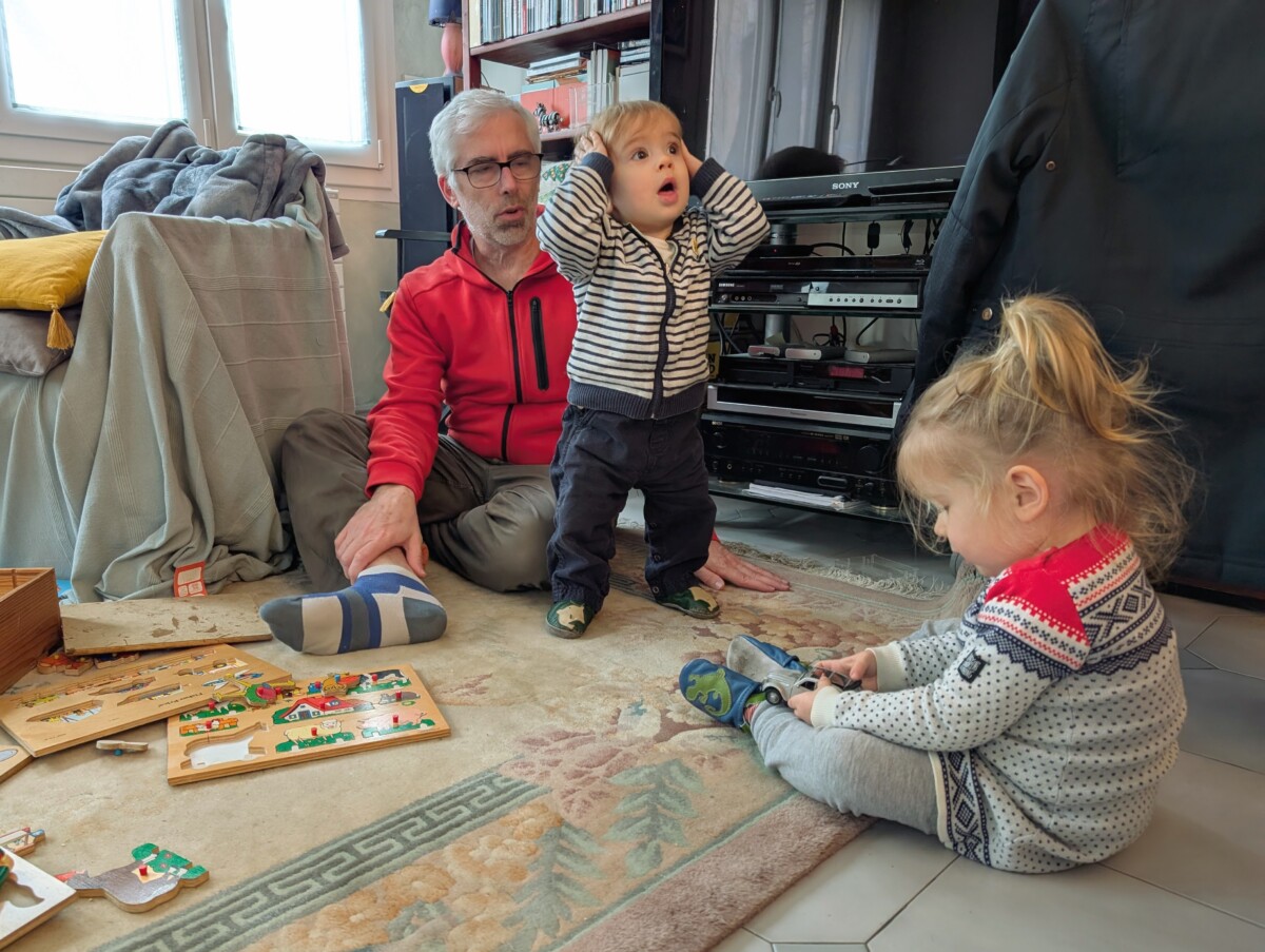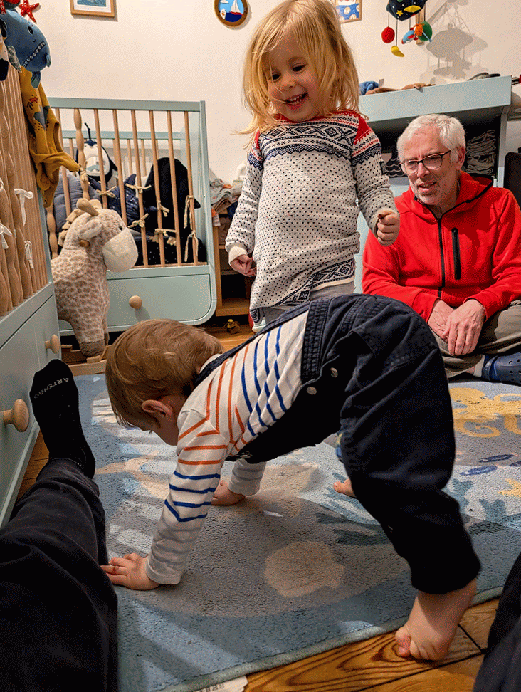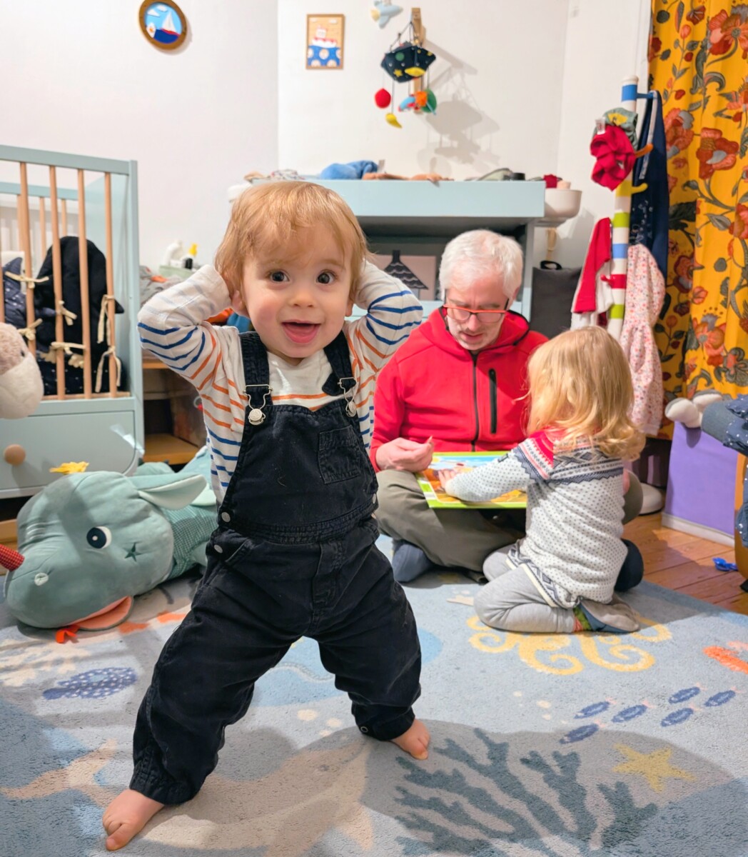 Depuis qu’il sait se dresser sur deux pattes, c’est-à-dire depuis mi-octobre 2025 (à 8 mois), il passe une sacrée proportion de son temps d’éveil en position verticale. C’est lui qui passe le plus de temps debout de toute la section des Bébés, nous a-t-on dit à la crèche. Il s’accroche aux barreaux de son lit, à la porte du congélateur, à la barrière du salon, et s’appuie sur le canapé, la table basse, la cuisine à dinette reçue à Noël… Et depuis octobre, il a progressivement appris à naviguer en passant de meuble en meuble. Ca s’appelle «caboter», nous a appris la pédiatre.