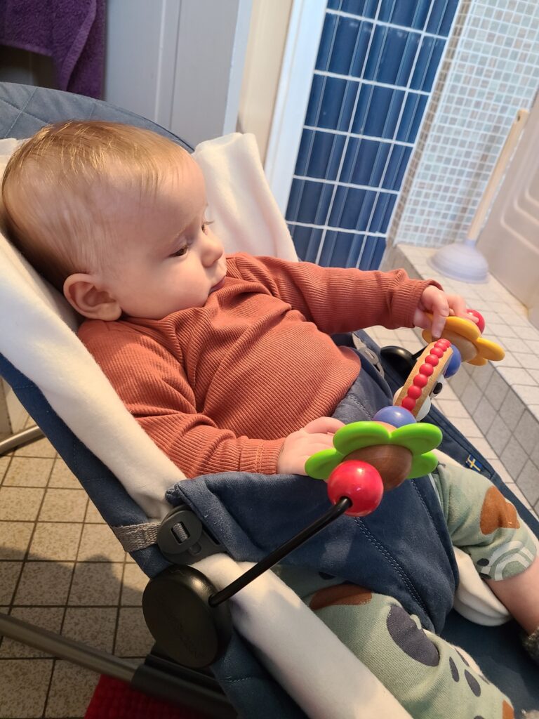 Ce matin, on a installé la barre à jouets de son transat, qui était restée dans un placard jusqu’ici. Au bout de deux minutes, elle s’est mise à l’observer attentivement. Et elle a même mis sa main sur la fleur jaune, qui a tourné… plusieurs fois en plus. Oh là là, bravo Ellie 💛