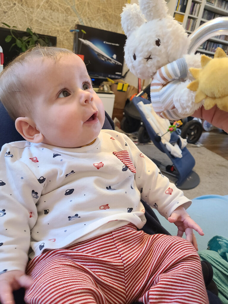 Quand on la couche dans son «grand» lit et qu’elle ne sombre pas tout de suite, elle commence aussi à jour avec la spirale de peluches accrochée sur le bord du lit. Toute seule, toute sage et en silence, elle regarde les jouets, puis attrape la grenouille ou l’oie.