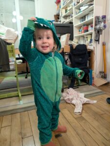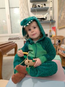 Officiellement, c’est un « surpyjama » je crois, déniché d’occas’ chez une Ermontoise. 5 min à l’attendre sur le parking de la Poste sous la pluie, c’était l’un de mes rendez-vous Vinted les plus glamours ! Mais j’étais tellement contente en rentrant à la maison avec mon crocodile dans la main… et le sourire d’Ellie vaut tout l’or du monde : «un cocodile !!»