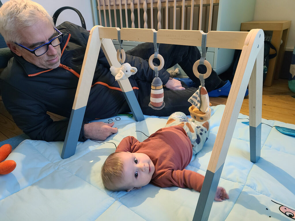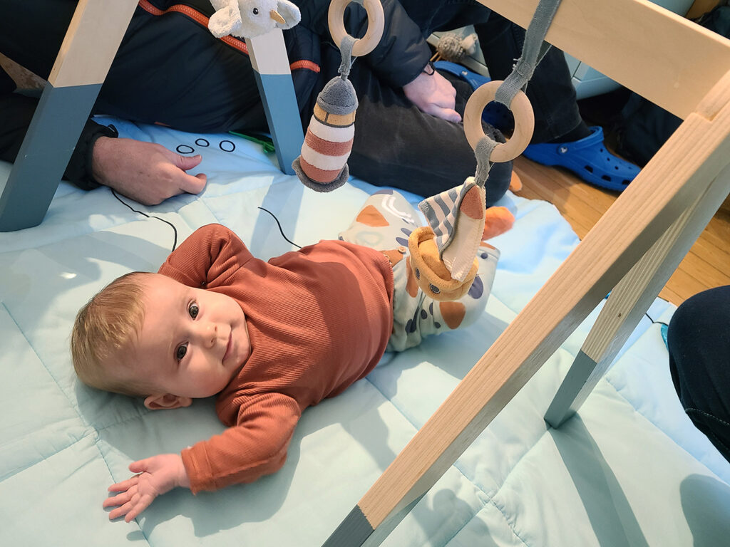 Demoiselle Ellie commence à montrer de l’intérêt pour les bitoniaux colorés qu’on agite devant son nez… Autrement dit, les jouets ! On lui a donc commandé un joli portique, qu’on a attendu avec impatience et qui est arrivé cette semaine. Toujours dans le thème marin de la chambre, il a un voilier avec des voiles qui font un bruit de papier froissé, un phare avec un petit miroir sur le dessous, et une mouette qui fait pouêt-pouêt.