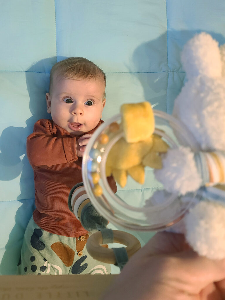 Autre jouet qui a eu son petit succès : le lapin hochet reçu de mamie Suzanne et papi Jean-Michel à Noël 🐰🌞