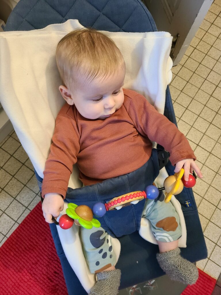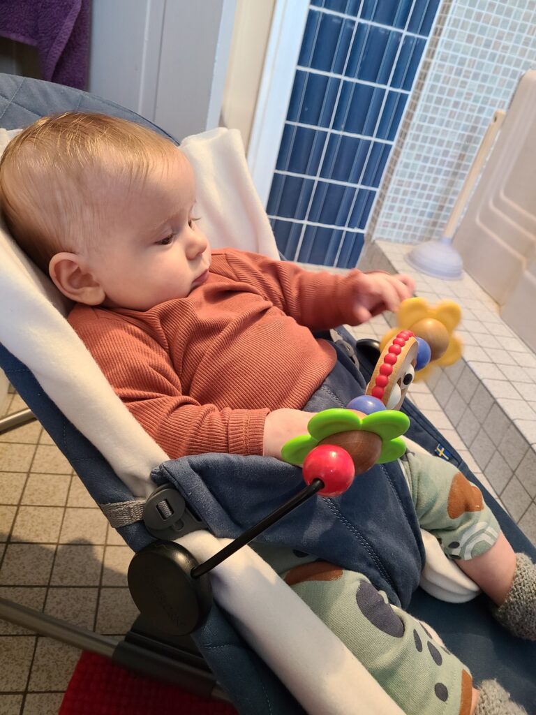 Ce matin, on a installé la barre à jouets de son transat, qui était restée dans un placard jusqu’ici. Au bout de deux minutes, elle s’est mise à l’observer attentivement. Et elle a même mis sa main sur la fleur jaune, qui a tourné… plusieurs fois en plus. Oh là là, bravo Ellie 💛