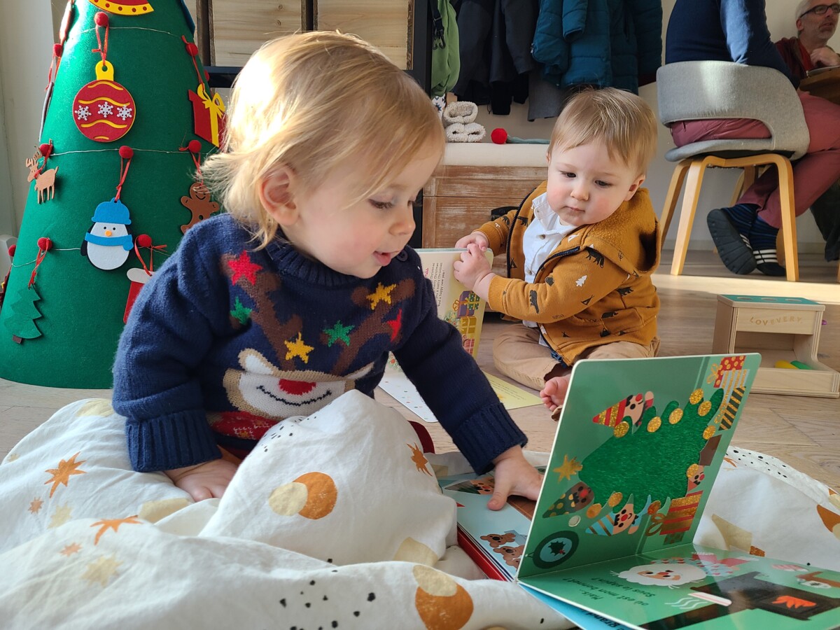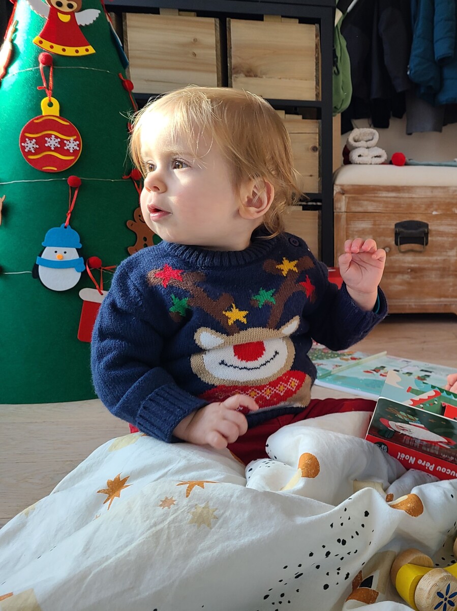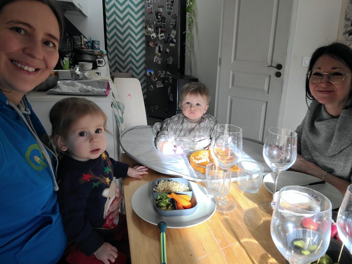 Pendant que les grands s’enfilaient une fondue savoyarde, les petits ont aussi partagé un repas : carottes, coquillettes et poisson, avocats. Avec une cuillère, et beaucoup avec les doigts ! Ce délice…