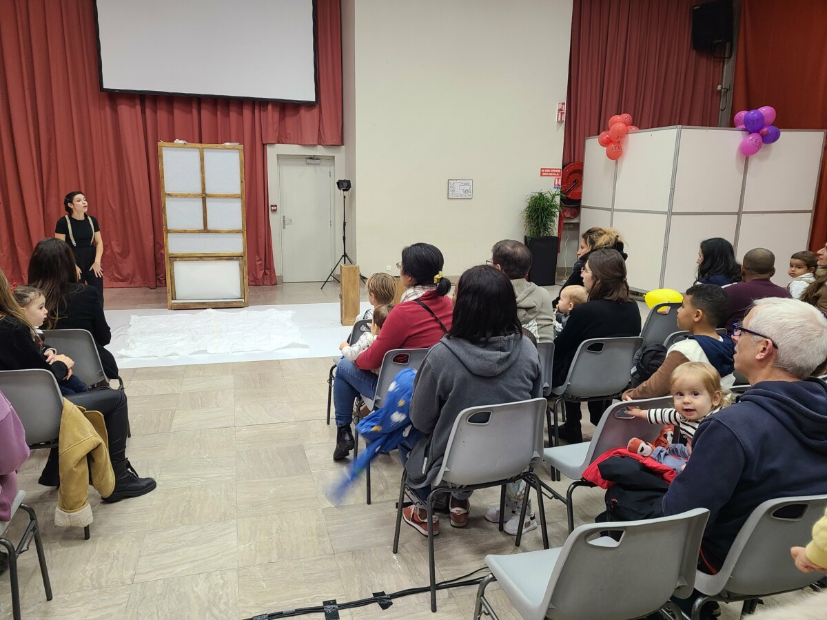 Il y avait un pestacle de 30 minutes spécialement conçu pour un public de 1 à 2 ans. Une comédienne seule en scène, qui jouait avec une grande feuille de papier froissée, et de la peinture de couleur vive…