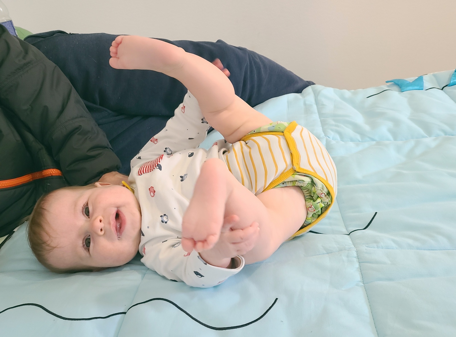 L’effet a été immédiat : dès la première séance sur le nouveau tapis, il a réussi à avancer en tirant sur un (seul) bras et en poussant sur une (seule) jambe. On est tout contents et hyper fiers, il te débrouille comme un chef !